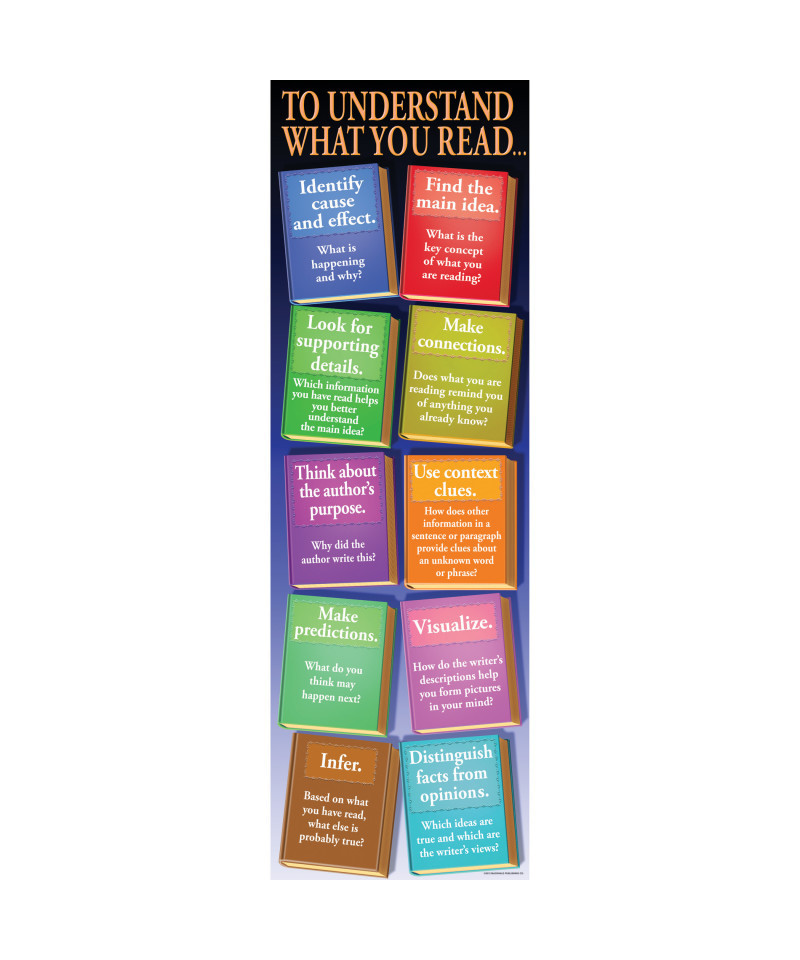 This large poster (over 5-1/2 feet tall) displays 10 key reading comprehension strategies and presents related questions students can answer in order to apply those strategies effectively. The teacher’s guide provides additional information and a variety of activities to help students become more active readers. Poster measures 22" x 68".