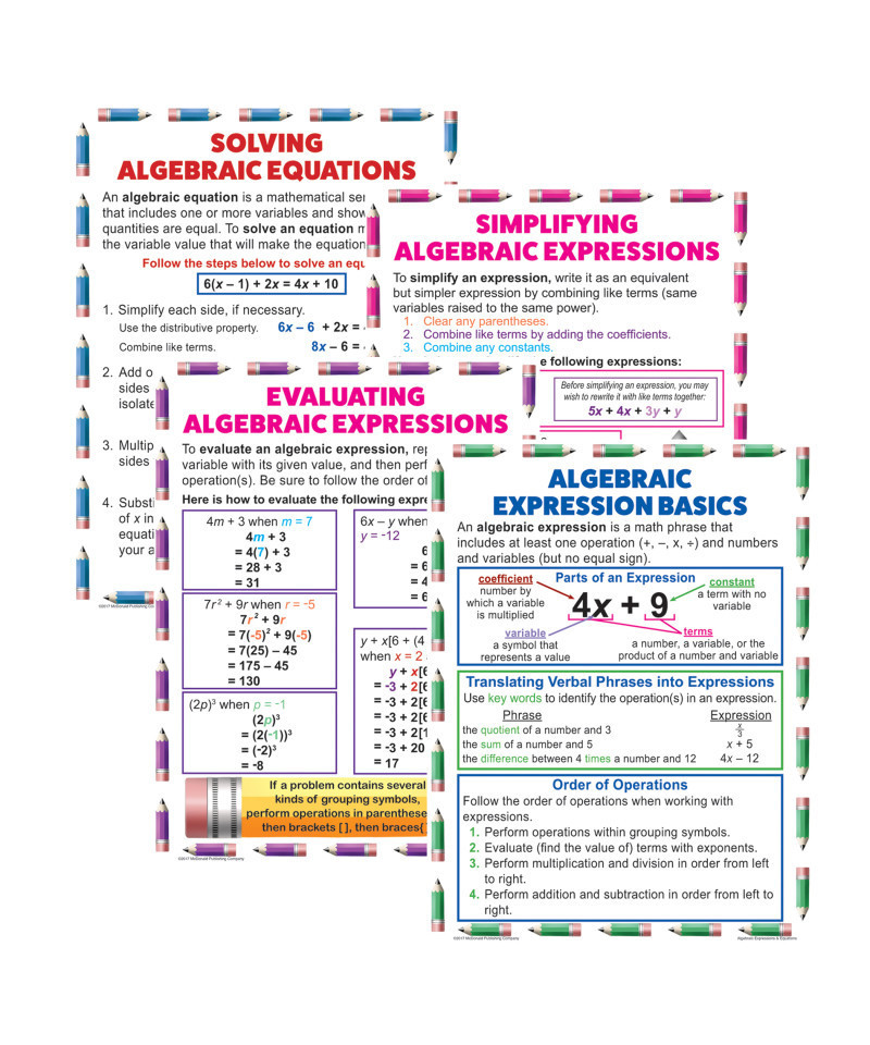 These posters clearly explain the difference between an expression and an equation, teach the steps for evaluating and simplifying expressions, and show how to solve equations. Includes 4 posters. Each poster measures 17" x 22".