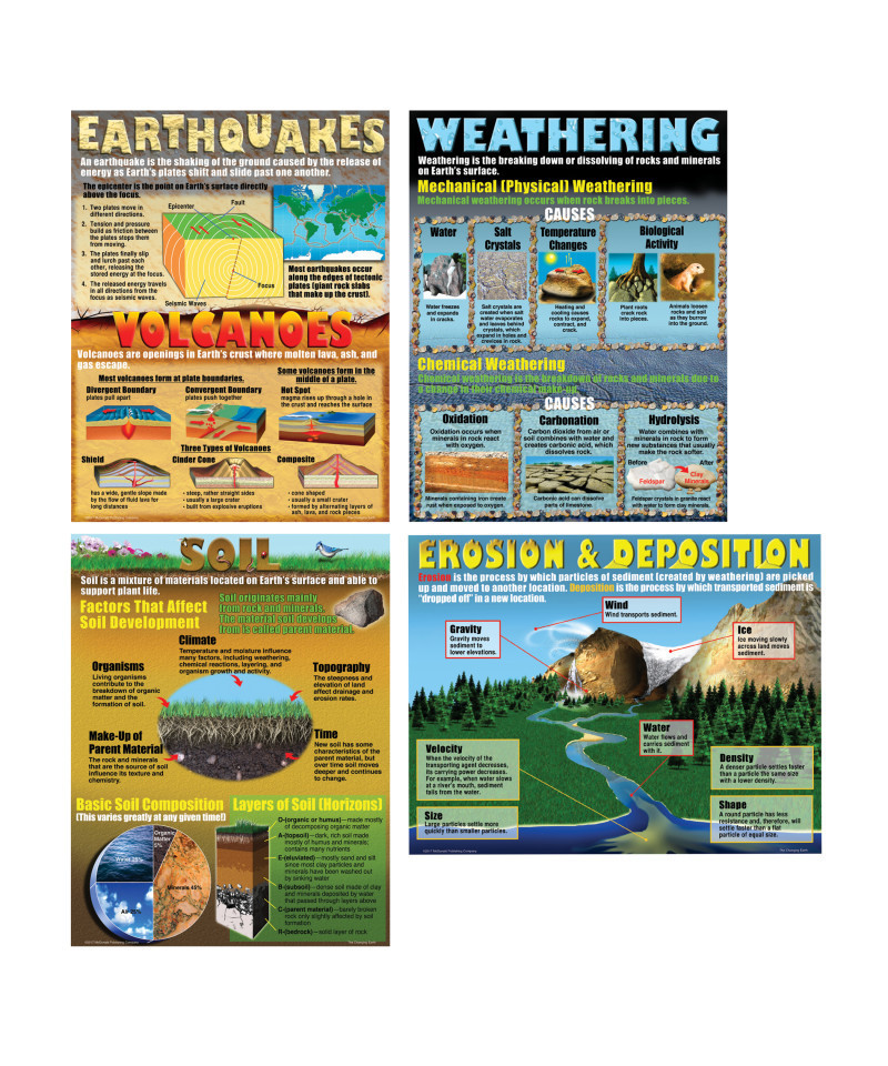 These posters address three forces largely responsible for shaping Earth’s landscape: weathering, erosion, and deposition. The posters also present key information about soil composition, earthquakes, and volcanoes. Includes 4 posters. Each poster measures 17" x 22".