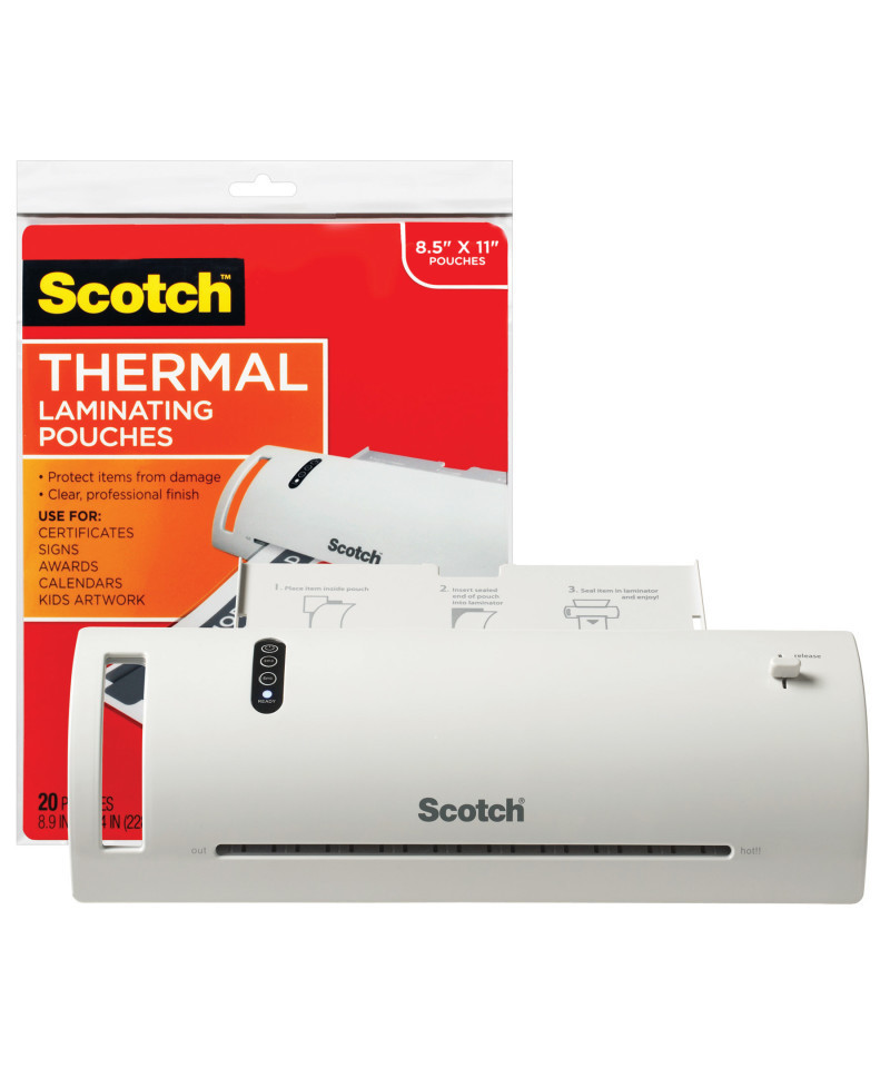 This Scotch Thermal Laminator protects documents you handle frequently. Photo-safe, versatile machine works with multiple pouch sizes. Laminate documents and photos up to 9" wide and pouches with a thickness up to 5 mil. Saves time with a four minute warm-up, feed time of 11-1/2" per minute and a pouch-release mechanism. Sleek, portable design also includes two-roller system with two temperature settings, fold-in-tray, cord storage and handle. Thermal laminator combo pack contains one laminator and 20 high-quality laminating pouches. Pouches hold sheets up to 8-1/2" x 11".
