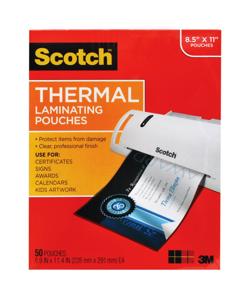 Scotch Thermal Laminating Pouches protect documents you handle frequently. These 3 mil thick thermal laminating pouches are clear to let important information show through. Great for children's artwork! Pouches measure 8.9" x 11.4", and hold documents up to 8.5" x 11". Includes 50 per pack.