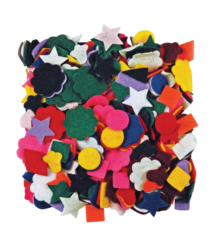 Enhance flannel board art with Felt Shapes: unique shapes in bright colors! The fuzzy material is a great tactile learning material, fun to touch, easy to glue and a great art material! Lots of colors and shapes. Each pack includes 500 pieces.