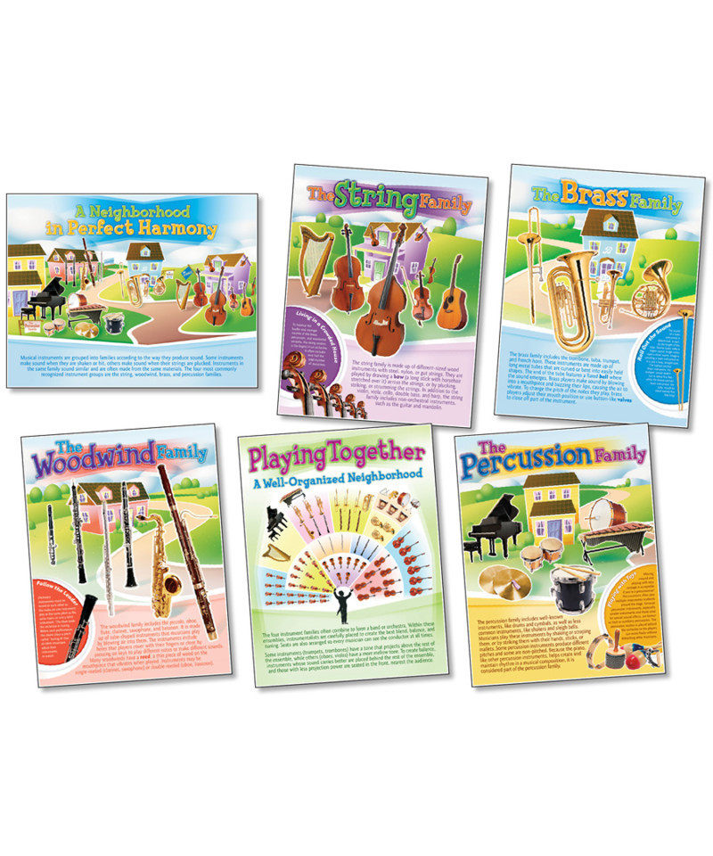 Invite students to explore a unique neighborhood inhabited entirely by musical instrument families. Imaginative illustrations of individual households provide an engaging backdrop for photographs of the four primary instrument groups. A coordinating poster focuses on combining the instrument families into an orchestra or band. Features six 17'' x 22'' (43.2 x 55.9 cm) posters and a four-page teacher guide with reproducibles.