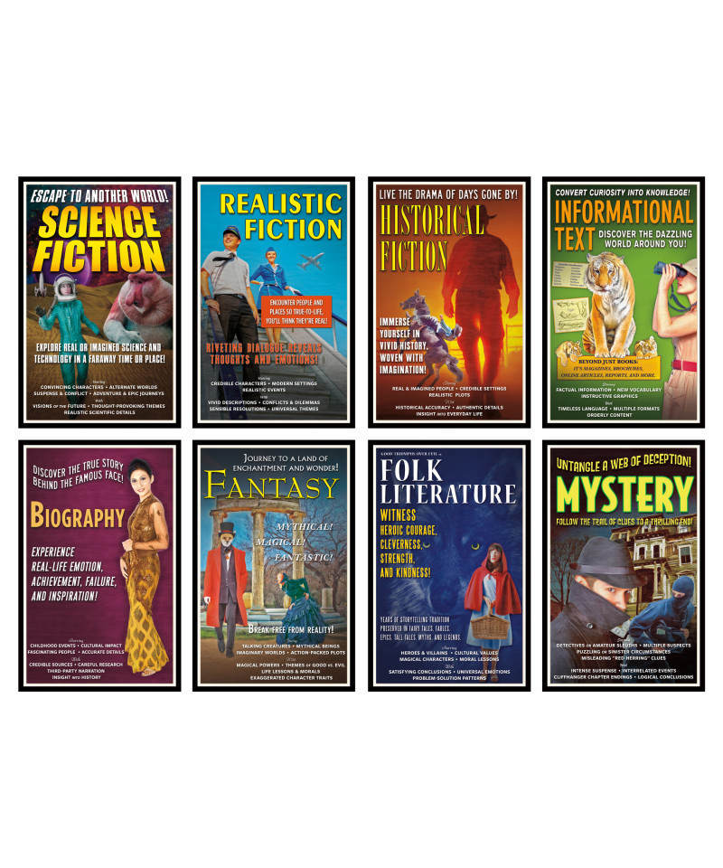 Shine a spotlight on literary genres with this innovative approach to teaching fundamental subject matter. Styled after vintage movie posters, this bulletin board set acquaints students with eight major genres of literature, highlighting common themes, character traits, settings, story structures, and literary devices. From the intense suspense and puzzling events of a mystery to the well-researched, chronological details of a biography, each poster offers a snapshot of the featured genre's major elements. Includes eight 11" x 17" (27.9 x 43.2 cm) posters and a two-page teacher guide. 8 pieces.