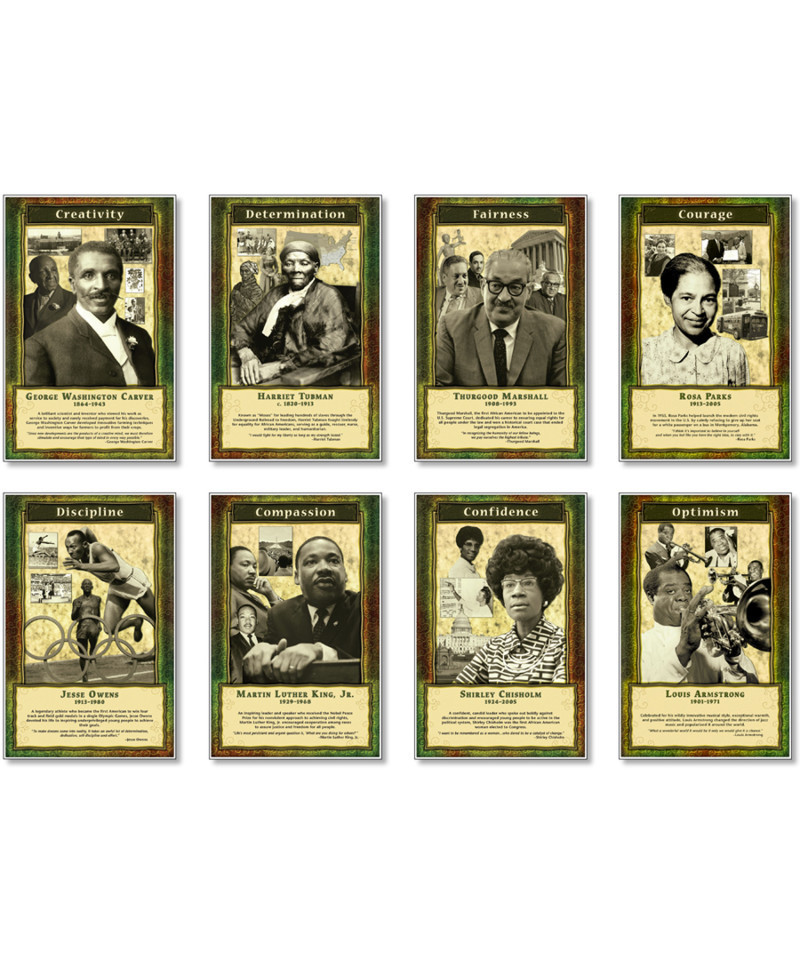 Familiarize students with some of the most powerful character traits demonstrated by successful leaders throughout history. Eight 11" x 17" (27.9 x 43.2 cm) posters feature well-known African American historical figures, their leadership qualities, and the influence of these characteristics on their achievements. Inspirational quotes from each individual underscore their exemplary leadership qualities. Includes 8 pieces.