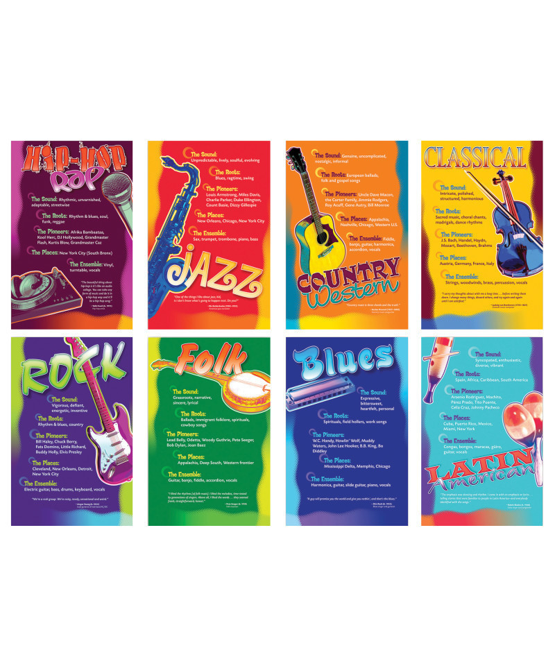 Set the stage for a fresh, new approach to music education with the Music Genres bulletin board. From the impromptu variations of jazz to the structured harmonies of classical music, this bulletin board acquaints students with eight top music genres, highlighting the foundations and history, as well as the signature sounds and instruments of each genre. Includes eight 11" x 17" (27.9 x 43.2 cm) posters and a two-page teacher guide.