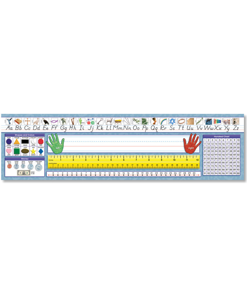 Improve learning levels with handy desk references. Simply write in student names and tape to student desks for year-round use. Primary desk plates include photo alphabet line, name plate with left and right handprints, 12" (30 cm) ruler, number line (0 to 30), shapes and colors, money, and hundred chart. Measures 19" x 5" (48.3 X 12.7 cm). Each pack includes 36 desk plates. Note: Traditional Manuscript font.