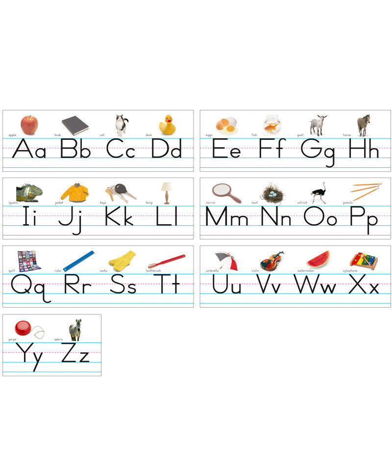 Use these alphabet lines to teach the alphabet and proper letter formation. Each alphabet line measures over 14' (4.3 m) long when assembled. Seven 24 1/4" x 7 5/8" (61.6 x 19.4 cm) strips per package.