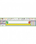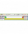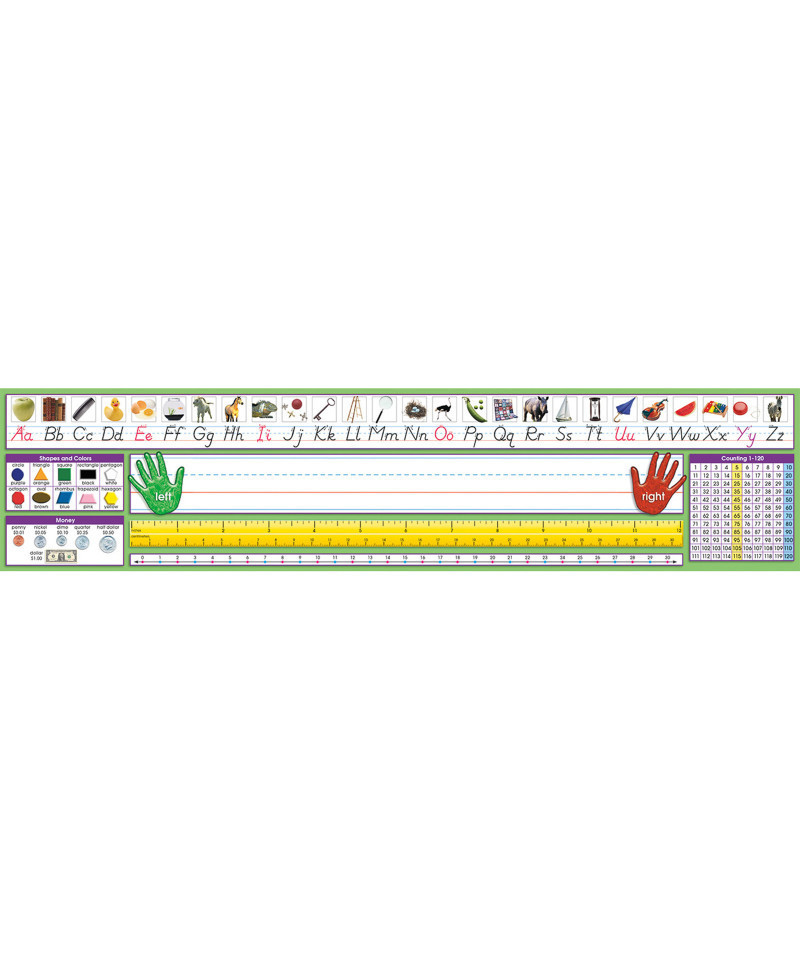 Adhesive desk plates label students' work areas and provide a quick reference to frequently used information - without damaging work surfaces or leaving a sticky residue. Adhere to desks, tabletops, lockers, notebooks and other smooth surfaces. Peel off cleanly from most surfaces. Allows for repositioning: gently lift and re-affix. Features a write-on surface compatible with most markers and pens. This Primary desk plate includes Modern Manuscript photo alphabet line, name plate with left and right handprints, 12" (30 cm) ruler, number line (0 to 30), shapes and colors, U.S. currency and hundred chart. Each measures 17-1/2" x 4" (44.5 X 10.2 cm). Each pack includes 36 desk plates.
