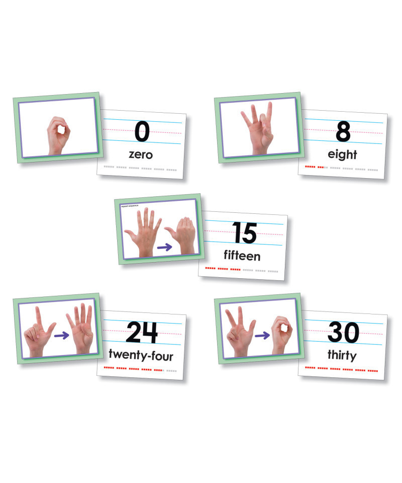 Familiarize students with the American Sign Language numbers zero through 30. Each numbers card features a photo of the hand sign for a number on one side, and the numeral, word, and counting block pattern on the reverse side. Includes 31 self-checking, two-sided 6" x 8" (15.2 x 20.3 cm) cards and a teacher guide.