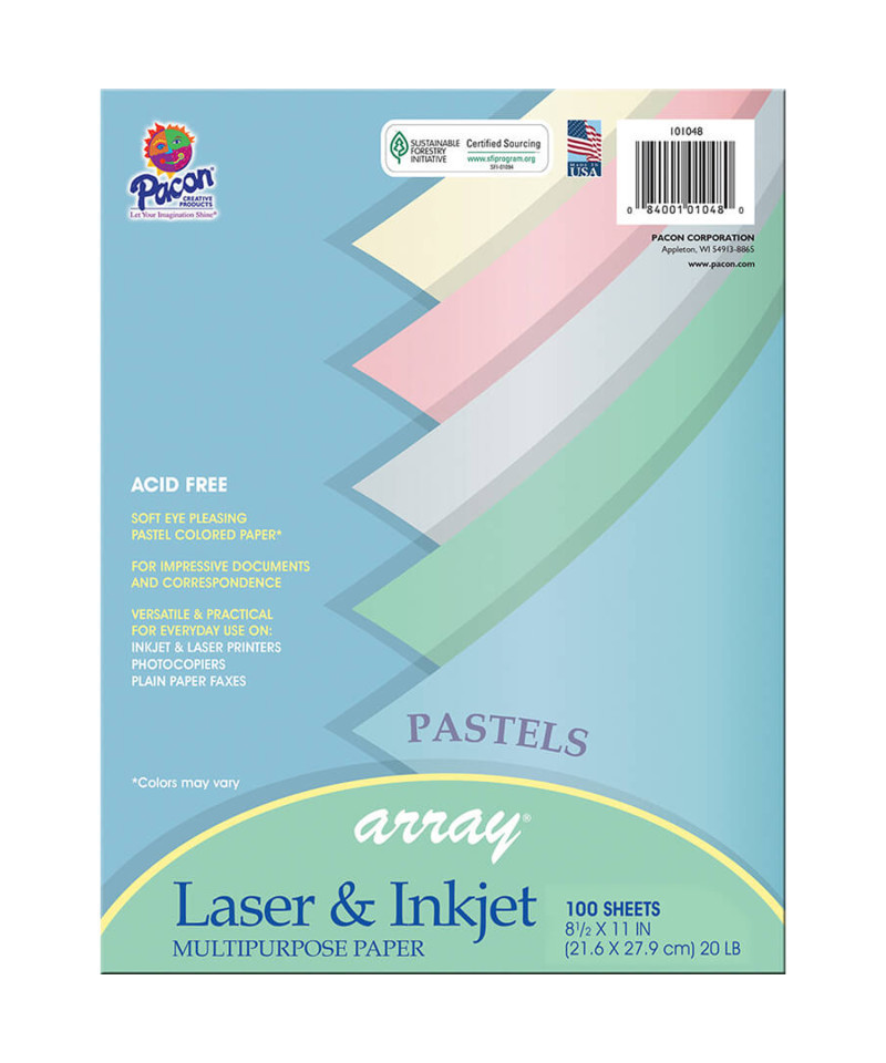 Subtle pastel colored paper adds a soft, delicate touch to documents. This 20 lb. paper works well in laser and inkjet printers, photocopiers and offset printers. Assorted five colors include: Watermelon, Sky Blue, Green, Ivory and Gray. Acid-free and recyclable. Each pack includes 100 sheets. Each sheet measures 8.5" x 11".