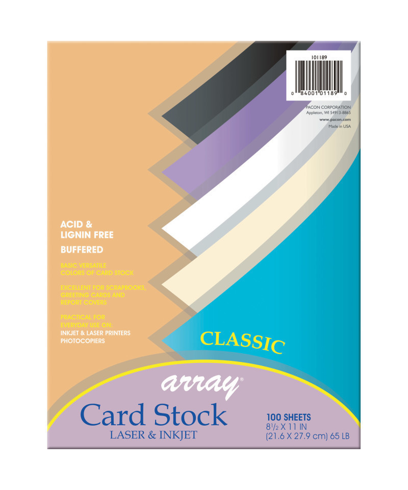 Heavyweight, 65 lb. acid-free paper is perfect for greeting cards, postcard, report covers, rubber stamping, memory books, flyers, announcements and more. Lignin free and buffered. Acid-free and recyclable. Assortment includes: Ivory, Black, White, Violet and Cobalt Blue. Each pack includes 100 sheets. Each sheet measures 8.5" x 11".