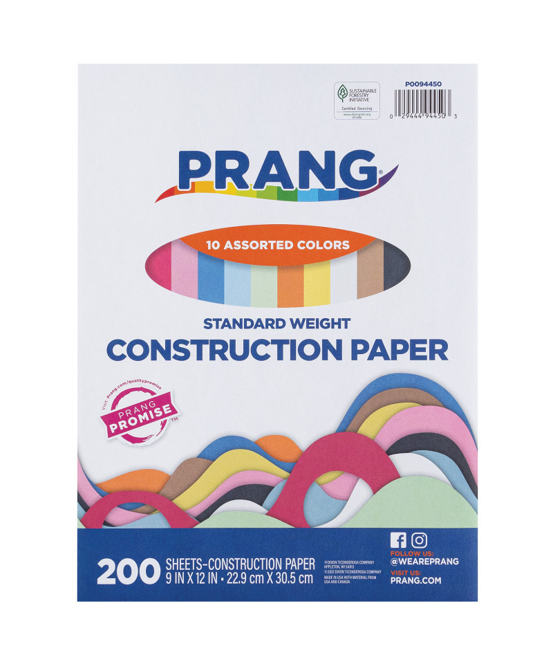 Prang® 10 color assortment is perfect for beginner arts and crafts, and ideal for young children. Colors include: White, Sky Blue, Blue, Pink, Scarlet, Orange, Brown, Yellow, Green, and Black. Works great for cutting, pasting, doodling and folding. Recyclable. Measures 9" x 12". Each pack includes 200 sheets.
