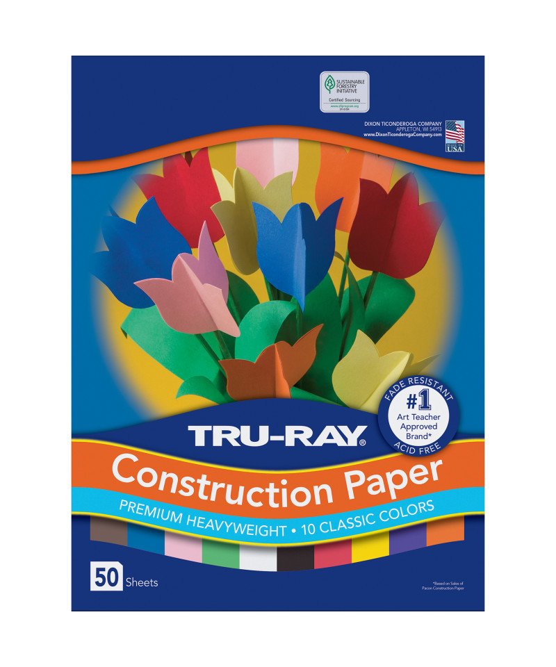 Heavyweight 100% vat-dyed sulphite with longer, stronger fibers. Tru-Ray® Construction Paper is tough enough to take scoring, folding and curling without cracking and tearing. Its superior fade-resistance keeps projects brighter and fresher longer. Colors include: White, Black, Orange, Yellow, Festive Green, Pink, Purple, Blue, Dark Brown, and Red. Acid free for less fade. 50% recycled fiber content and recyclable. Measures 12" x 18". Each pack includes 50 sheets.