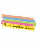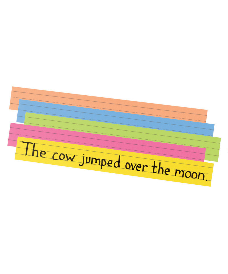 Sturdy tagboard stock has a 1-1/2" ruling with 3/4" dotted midline on one side and a single line ruled on the opposite side. These strips measure 3" x 24". Assorted colors include: Hot Orange, Hot Blue, Hot Lime, Hot Pink and Hot Yellow. Recyclable. Each film-wrapped pack includes 100 sentence strips.