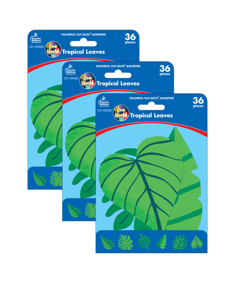 Decorate any area of your classroom with this pack of assorted One World Tropical Leaves Colorful Cut-Outs®. Printed on durable card stock, these cut-outs are ideal to use as desk tags, cubby tags, and much more. Each pack includes 36 cut-outs. Sold as 3 packs for a total of 108 cut-outs.