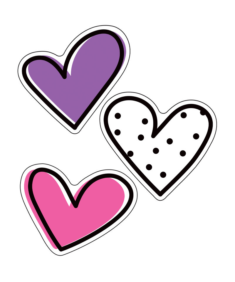 Decorate any area of your classroom with the 36-piece Kind Vibes Doodle Hearts Colorful Cut-Outs®. Featuring cheerful shades of color or black and white, these cut-outs are sure to add a touch of fun to any space. This pack includes these assorted designs, ranging in size from the largest, 5.83" x 5.48" to the smallest, 5.46" x 4.55":• 3 each: blue, green, lime, orange, pink, purple, teal, yellow