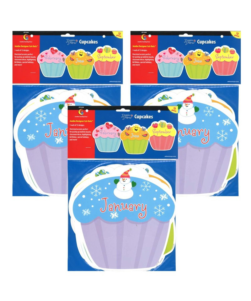 These versatile jumbo cut-outs are perfect for enhancing bulletin boards, rooms, hallways, and common areas for any birthday celebration! These versatile cut-outs are perfect for crafting projects, game pieces, writing notes or invitations, memory games, more! Acid-free. Coordinates with Poppin' Patterns products. Cupcakes measure approximately 10" x 10". Each pack includes 12 pieces, 1 cupcake for each month. Sold as 3 packs for 36 pieces total.