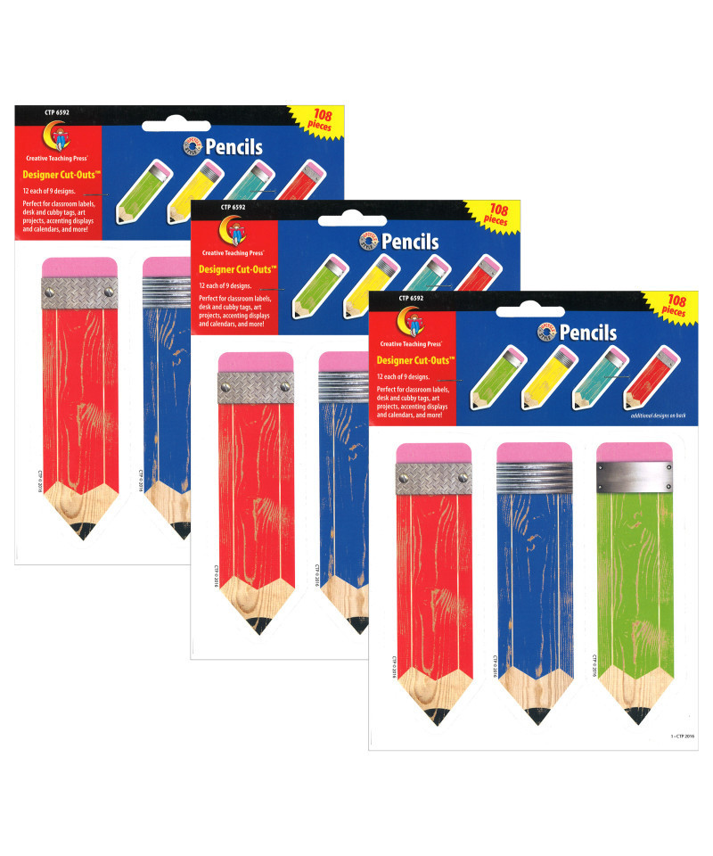 These colorful wooden Pencils 6" cut-outs are an iconic symbol of school and learning. The realistic-looking worn paint, metal banding and bright colors give these pencils cut-outs a familiar yet modern feel. The 6" cut-out size is perfect for accenting bulletin boards, as well as for use in writing centers, writing-based projects; art displays; crafts, and classroom organization/labeling. Each pack includes 108 pieces, 12 each of 9 designs. Sold as 3 packs for a total of 324 pieces.