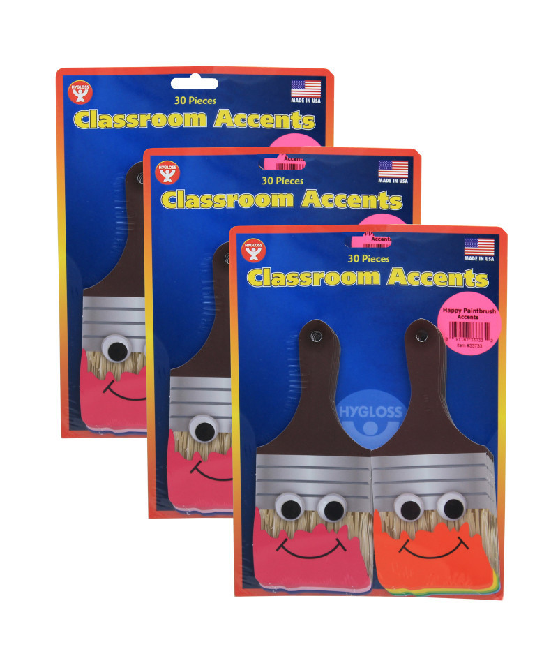 Choose Happy Paintbrush Accents from our selection of Classroom Accents, made of card stock paper, and use as a classroom decoration to put a smile on everyone's face, as well as an innovative teaching aid. Hygloss die cut Accents are a colorful complement to any classroom! Each pack includes 30 pieces. Sold as 3 packs for a total of 90 pieces.
