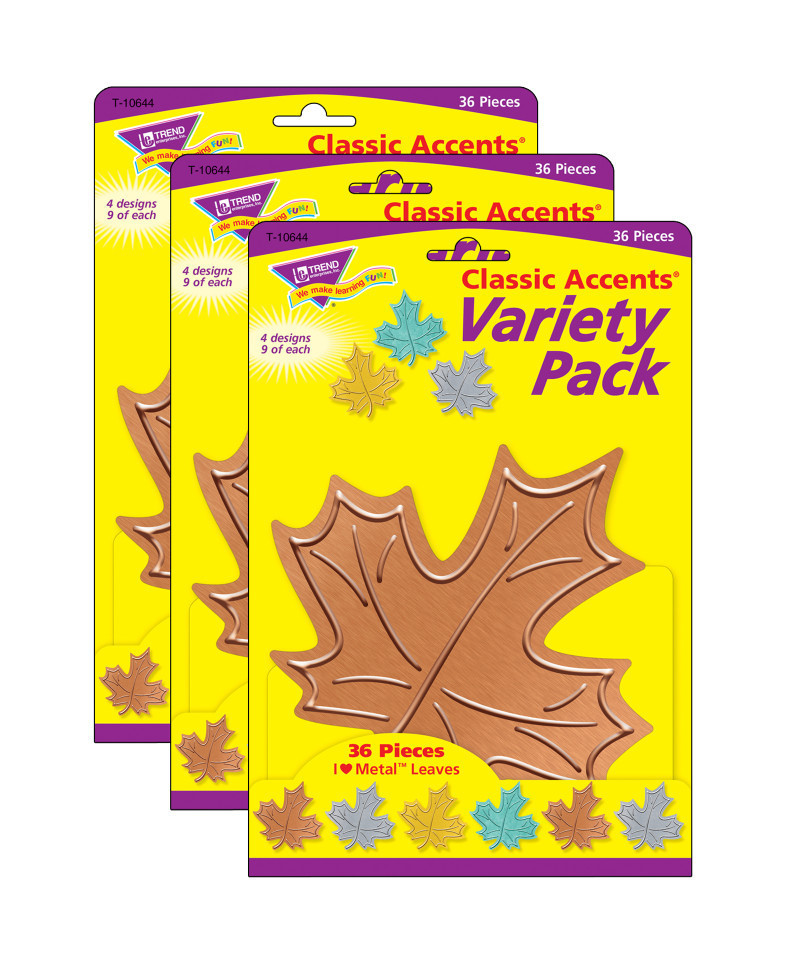 Packed with personality! Endless ways to energize, delight, engage. Label storage centers & lockers, create eye-catching displays, showcase student work, inspire creativity, and reward success. Coordinates with I ♥ Metal™ Collection. Precut and ready to use. Accents are 6" tall. Colors included are gold, silver, copper and patina. Each pack includes 36 accents. Sold as 3 packs for a total of 108 accents.