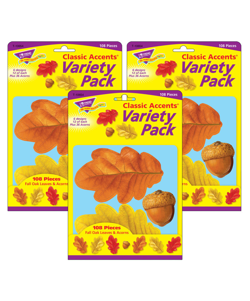 Vibrant designs energize spaces and delight and engage viewers. Label containers, lockers and centers, accent displays, decorate walls and posters, showcase student work, inspire creative writing, and reward accomplishments. Endless possibilities! Precut and ready to use. Durable and reusable. 72 leaves, about 5" long, plus 36 acorns. 108 pieces per pack. Sold as 3 packs for a total of 324 accents.