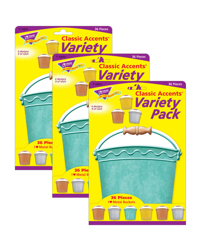 Vibrant designs energize spaces and delight and engage viewers. Label containers, lockers and centers, accent displays, decorate walls and posters, showcase student work, inspire creative writing, and reward accomplishments. Endless possibilities! Precut and ready to use. 6" tall buckets with four embossed-side patterns: gold, silver, copper, patina. Slit along edge allows for bucket to be "filled" with notes, compliments, jobs, fortunes, more! Each pack includes 36 accents. Sold as 3 packs for a total of 108 accents.