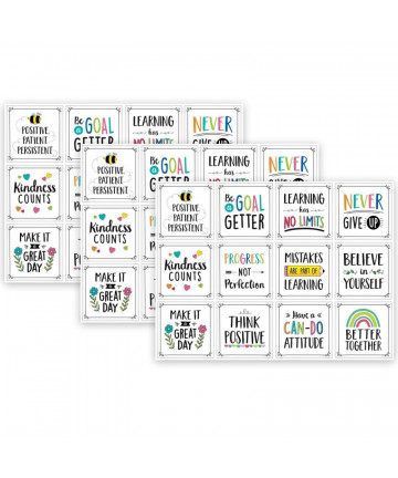 Vibrant designs energize spaces and delight and engage viewers. Label containers, lockers and centers, accent displays, decorate walls and posters, showcase student work, inspire creative writing, and reward accomplishments. Endless possibilities! Precut and ready to use. Durable and reusable. 6 designs, 6 of each. 5.5" - 6" tall. Each pack contains 36 accents. Sold as 3 packs for a total of 108 accents.