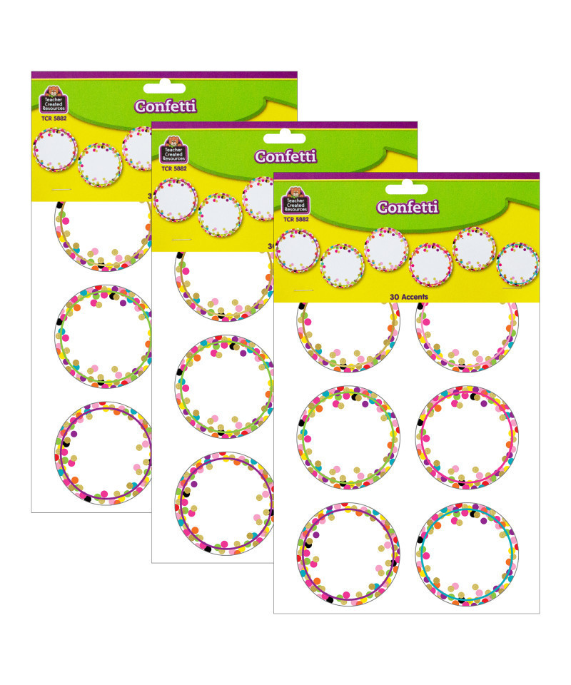 Use this decorative artwork to dress up classroom walls and doors, label bins and desks, or accent bulletin boards. Each accent measures approximately 6". Each pack contains 30 accents in 6 colors. Sold as 3 packs for a total of 90 accents.