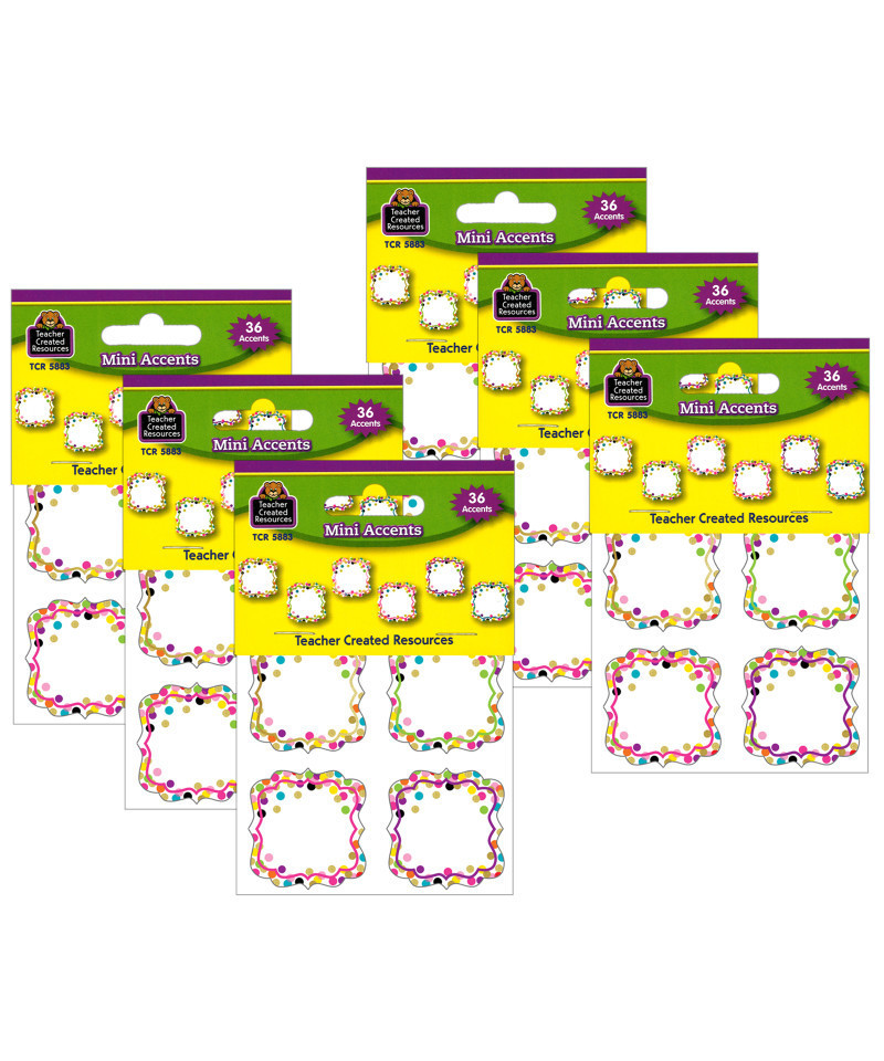 Have fun decorating with these colorful little pieces that measure about 2-5/8". Use them to accent displays, to fill in monthly calendars, or as pieces for learning games like sorting, patterning, and graphing. 6 colors. Measures approximately 2-5/8" x 2-5/8". Each pack includes 36 mini accents. Sold as 6 packs for a total of 216 mini accents.