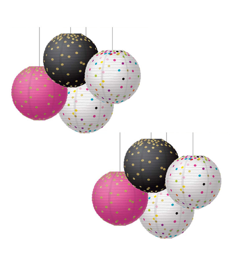 These colorful paper lanterns are great for adding a splash of color into your classroom. Coordinate with similar-patterned decoratives and popular color schemes to create the perfect look. Use them to fill up unused corners, hang accents off of them to organize work areas, or make a fun, inviting space for kids to learn. Each lantern is 8" in diameter. Each pack includes 6 lanterns: one each with gold foil dots on black, teal, and pink, and three multi-color confetti dots on white. Sold as 2 packs for a total of 12 lanterns.