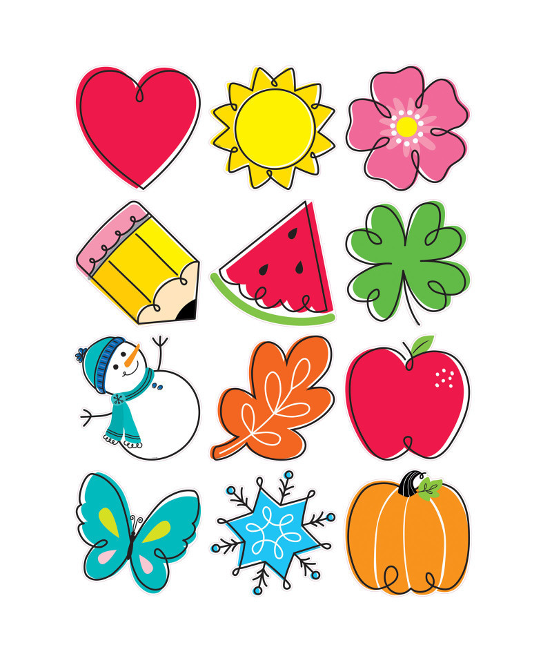 Adapting your wall display to fit the season is a snap with these Seasonal Accents 10" Designer Cut-Outs. The whimsical Doodle design of these 12 big cut-outs represent decorations for fall, winter, spring, and summer, as well as holiday decorations for Valentine's Day, St. Patrick's Day, Halloween, and Christmas.