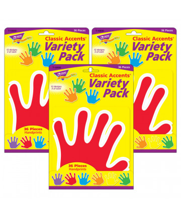 Use this decorative artwork to dress up classroom walls and doors, label bins and desks, or accent bulletin boards. Accents are in different colors. Each pack includes 30 accents in 10 designs. Sold as 3 packs for a total of 90 accents.