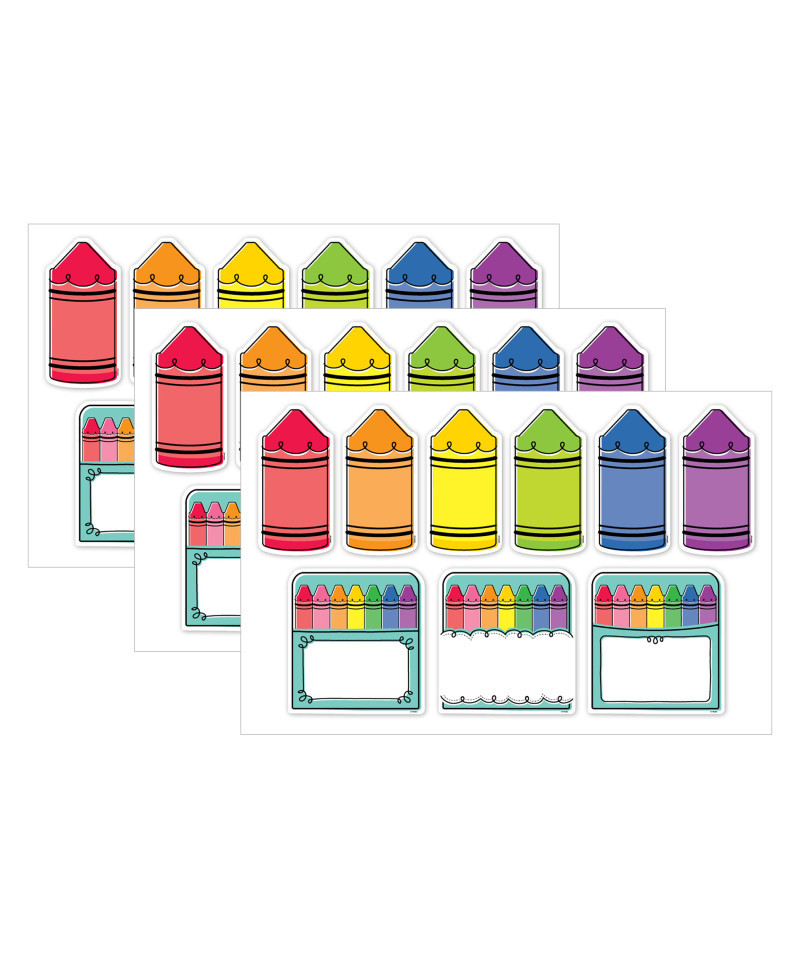Bring a rainbow of color to your learning environment with the chunky crayons and crayon packs depicted in the Doodle Crayons 6" Designer Cut-Outs. Use these versatile cut-outs for class messages, writing assignments, learning center activities, accenting bulletin boards, and more! They also make great labels on cubbies, student folders, supply bins, and binders. Each pack includes 54 pieces, 6 each of 9 designs: 6 Red crayon (2.875"w x 5.725"h each,) 6 Orange crayon (2.875"w x 5.725"h each), 6 Yellow crayon (2.875"w x 5.725"h each), 6 Green crayon (2.875"W x 5.725"H each), 6 Blue crayon (2.875"W x 5.725"H each), 6 Purple crayon (2.875"W x 5.725"H each), 6 Crayon pack 1 (5.25"w x 5.5"h each), 6 Crayon pack 2 (5.25"w x 5.5"h each), 6 Crayon pack 3 (5.25"w x 5.5"h each). Coordinates with Core Décor products. Sold as 3 packs for a total of 162 cut-outs.