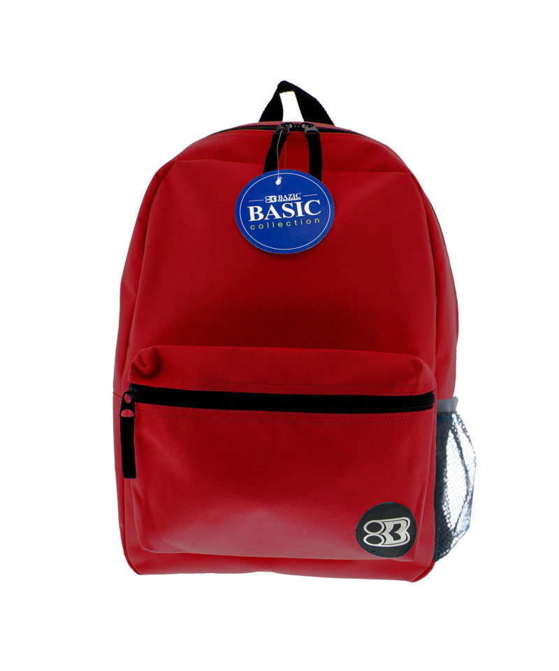 This 16" school bag features 2 compartments: one large compartment mainly for larger items such as text book, binders, and laptops, the other compartment is a smaller compartment located in front, mainly for smaller items, such as cell phones, keys, and hand sanitizer. Both compartments have zipper closure. There are 2 adjustable shoulder straps nicely padded for comfort when carrying the backpack. There are 2 zipper pulls for the large compartment, and 1 zipper pull for the smaller compartment. There is a nylon handle on top of the backpack, convenient for hanging the backpack on hook outside of classrooms, or any hanger. Bazic Products' logo is stitched in the front, on the bottom right of the small compartment for recognition.