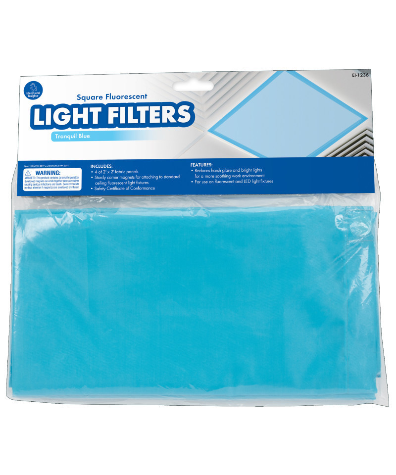 Fluorescent lights are a staple in classrooms and offices, but their harsh glare and flickering light can cause eyestrain, headaches, and anxiety. Cover your fluorescent and LED lights with these fabric panels that fit over standard ceiling fixtures with sturdy, sewn-in magnets. Each set includes four 2' x 2' heat-resistant panels in Tranquil Blue. For use with fluorescent and LED lights.