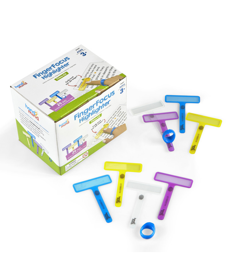Students will love these bright, transparent wants. The FingerFocus Highlighter is the perfect tool to help emerging readers easily track text as they learn to read. Each set includes a wearable ring and 4 interchangeable colored wands to help text stand out better on both page and screen. Classroom Kit includes 24 sets, for a total of 96 wands and 24 rings.