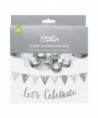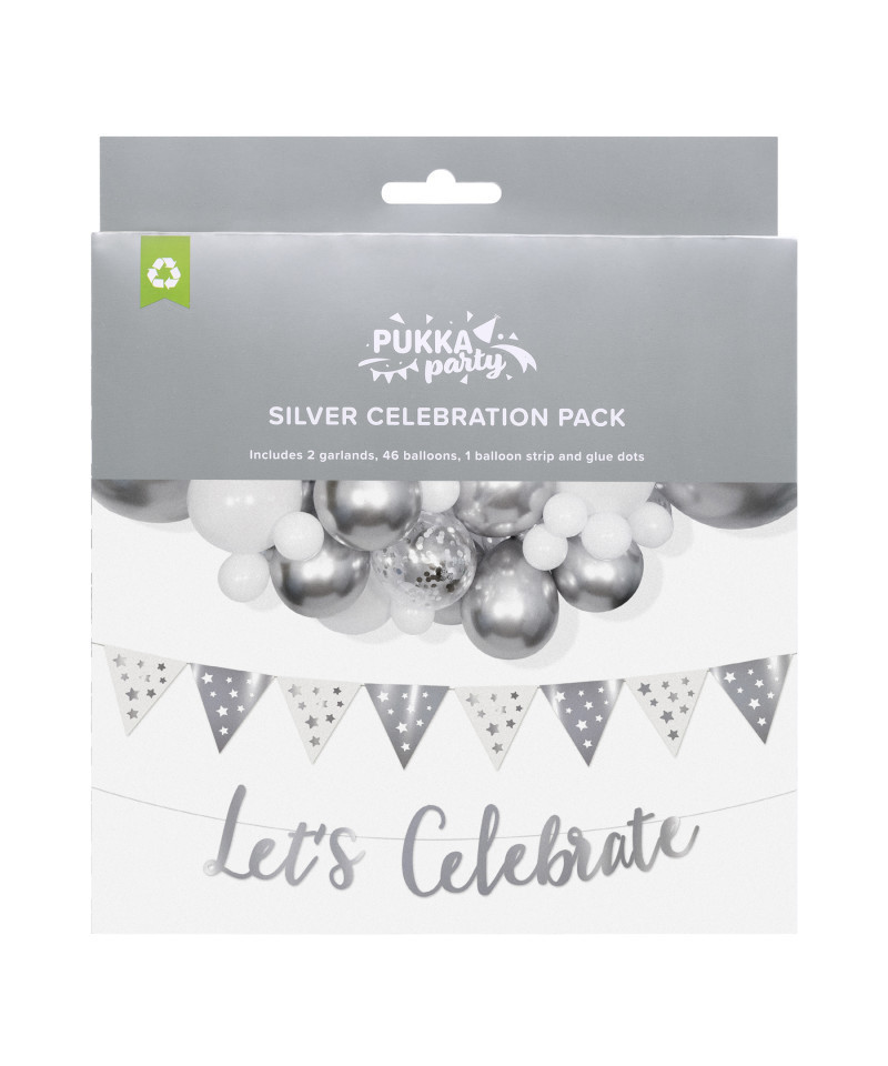 Transform your celebration into a sparkling, stylish event with the Pukka Party Silver Decoration Pack. Perfect for birthdays, anniversaries, New Year's parties, or graduations, this all-in-one kit brings effortless elegance and shimmer to any occasion. The set includes 46 silver latex balloons in 12" and 5" sizes, ideal for crafting a show-stopping balloon arch, complete with an 8 ft balloon strip and glue dots for easy setup. Complementing the balloons, the pack features a 6.5 ft stitched garland with a silver foil finish and an 8-piece pennant stitch bunting adorned with stars for added sparkle. A bold, foiled "Let's Celebrate" script garland completes the look, perfect for photo backdrops or statement walls. With coordinated décor elements, the Pukka Party Silver Decoration Pack ensures your party is both elegant and unforgettable.