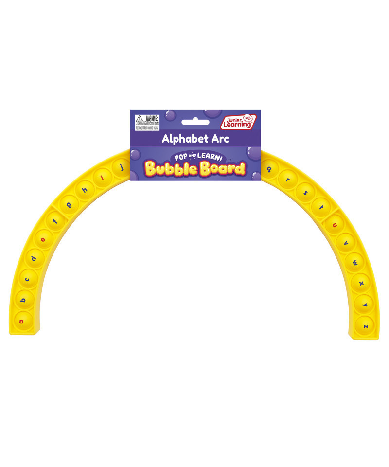 Learn the sequence and pattern of the alphabet. Pop letter bubbles to spell out words and play alphabet games. Includes one double-sided Bubble Board, with lowercase on the front side and uppercase on the reverse.