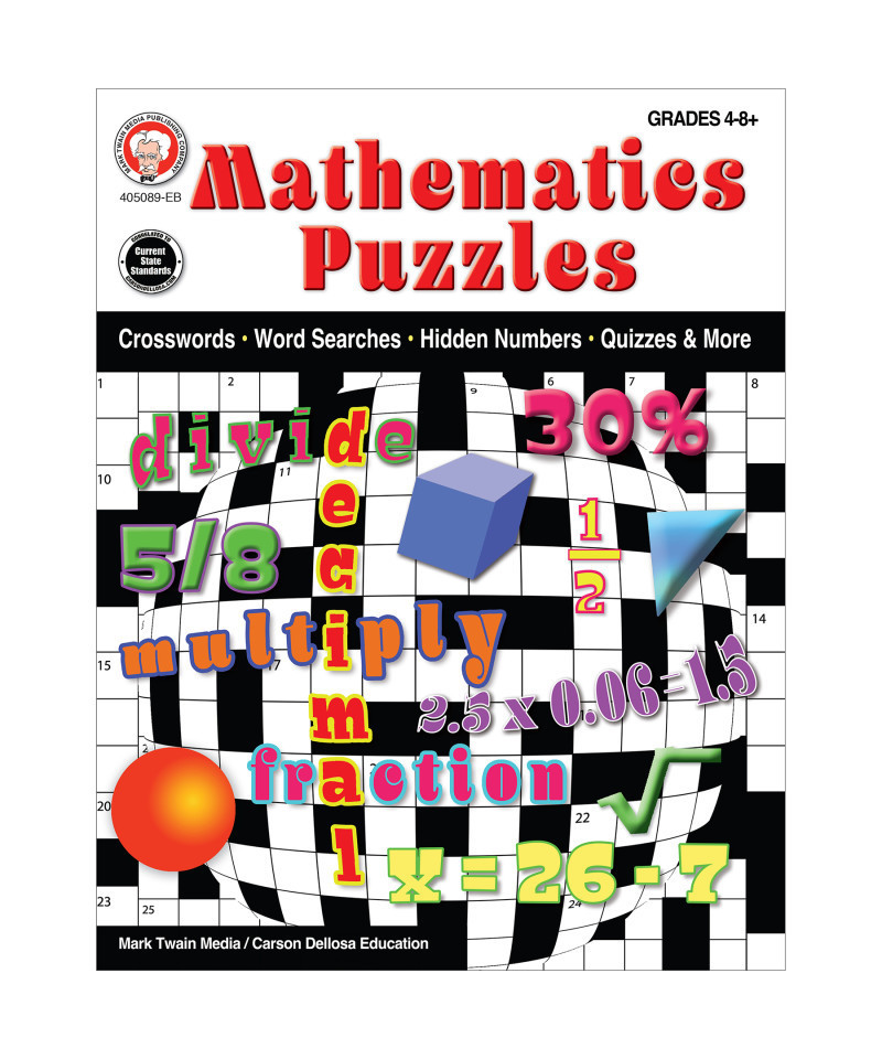 Help your 4th grade, 5th grade, middle school, or high school child build proficiency in math with the activity-packed Mark Twain Mathematics Puzzles Math Activity Book! Math activity books for kids are a great way for children to have a thorough understanding of math through fun and focused practice. Students practice place value, addition, subtraction, fractions, geometry, algebra, and more through crossword puzzles, word searches, and other fun and engaging math games and activities! The 48-page math book is sized at about 8" x 11"—giving your child plenty of space to complete each exercise. Use the answer key in the back of the math workbook to track your child's progress before moving on to new math games and activities. Designed by leading educators, Mark Twain Publishing Company specializes in providing captivating, supplemental books and resources in a wide range of subjects for middle- and upper-grade homeschool and classroom curriculum success.