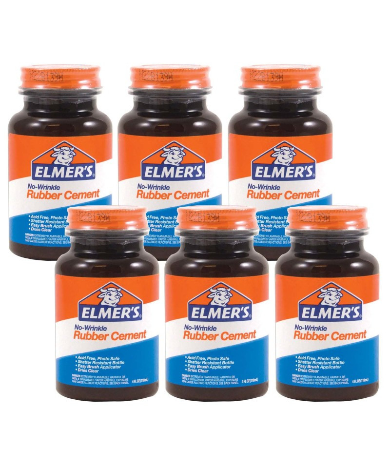 Elmer's No-Wrinkle Rubber Cement provides an easy solution for adhering photos and detailed cut-and-paste projects. The shatter-resistant container includes a brush-on applicator. Excess glue rubs off cleanly and shows no wrinkles as it dries! Elmer's No-Wrinkle Rubber Cement is acid free and photo safe. Each bottle includes 4oz. Sold as a pack of 6 bottles.
