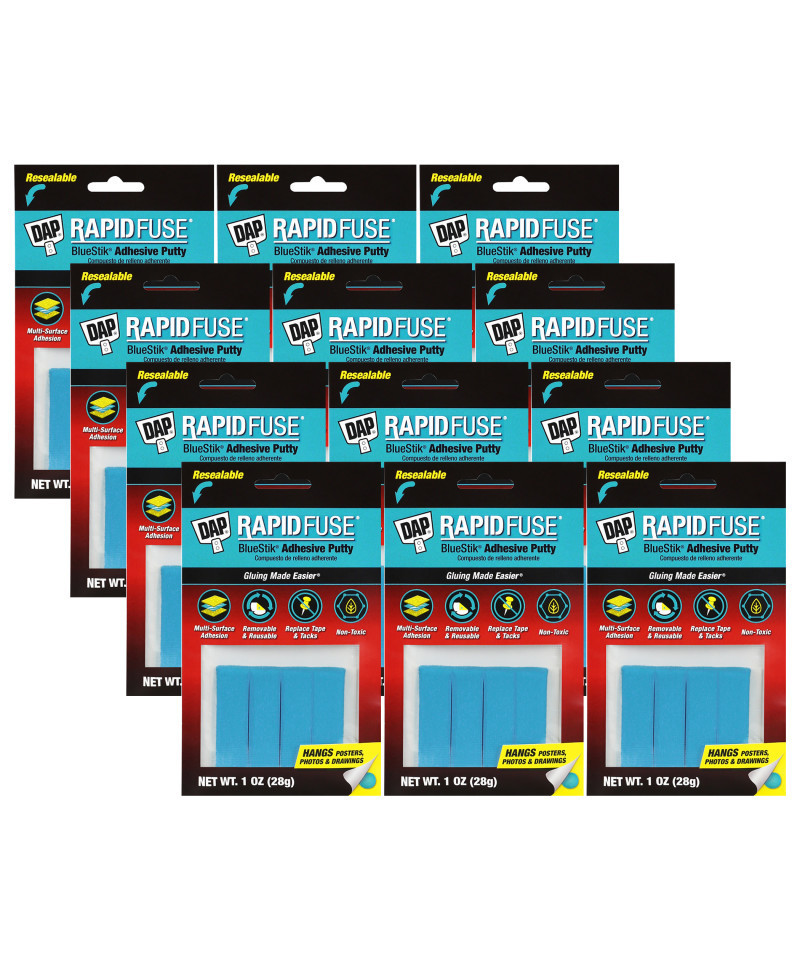 Reusable, removable blue adhesive putty that replaces tape, tacks, staples and magnets. No more holes in walls, and no more chipped, peeled paint. Sticks just about anything to slick or hard surfaces such as wood, tile, glass, concrete, porcelain, metal and painted surfaces. Use to fasten decorations, posters, notes and paintings. Can be used time and time again. Non-toxic. Conforms to ASTM D 4236. Each pack includes 1 oz. of putty. Sold as 12 packs.