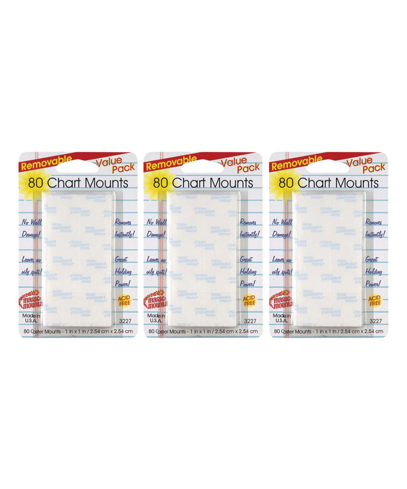 Our revolutionary adhesive bonding system secures tightly to most surfaces including drywall, painted block, brick, glass, tile, paneling and most other wall surfaces. And as one of the "original" removable adhesives, it removes cleanly with no residue, oily spots, or marring of walls... guaranteed! These wall savers get an "A." Teacher tested and preferred, this remarkable removable adhesive holds securely and removes cleanly up to 2 years. Removable Chart Mounting Tabs 1"x1". Each pack contains 80 chart mounts. Sold as a set of 3 packs, 240 chart mounts total.