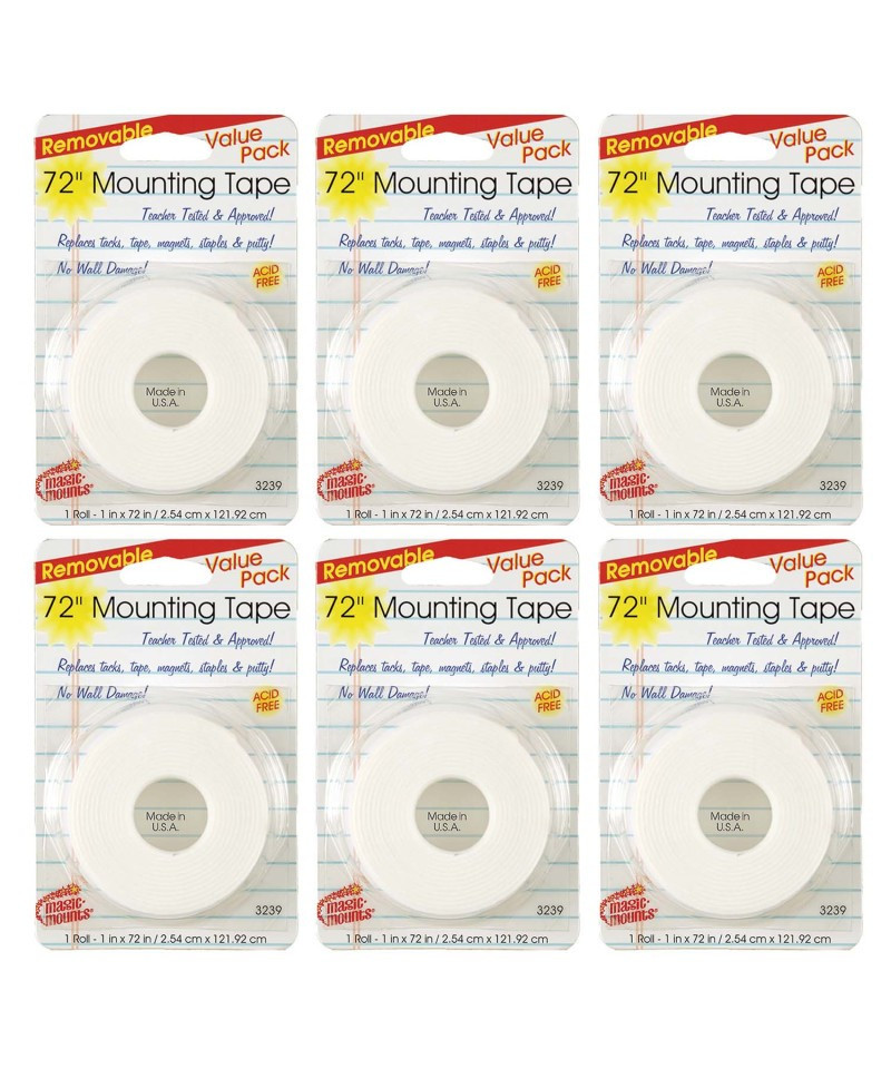 Teachers will love this strong holding removable tape for large projects. Won't remove paint or tear paper. Strong bonding adhesive adheres to most surfaces. Tape is remarkably removable and acid free. Cut to size required for larger applications. Each roll measures 1" x 72". Sold as a pack of 6 rolls.