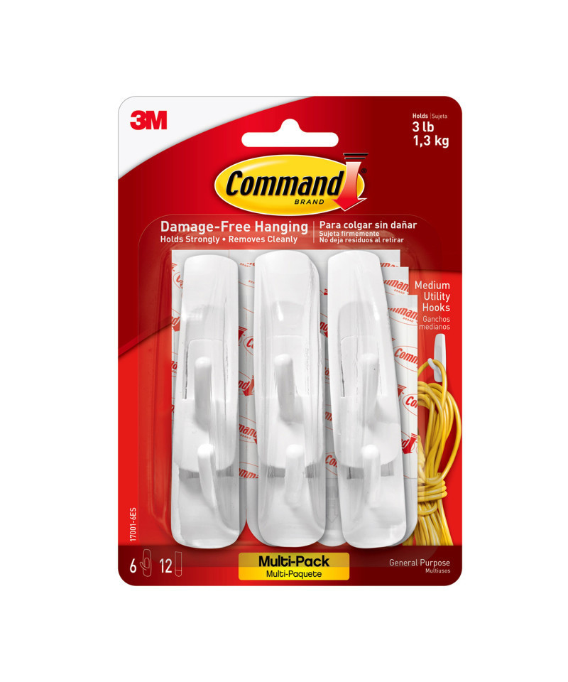 Life is easier when everything has its place. Organize your home damage free with Command Utility Hooks. Command Hooks let you hang what you want, where you want, without the hassle of tools and nails. Command Strips hold strongly on a variety of smooth, finished surfaces, and these adhesive hooks remove cleanly with no sticky residue or damage left behind. Now you can organize your home or office just the way you want with Command Utility Hooks. Each hook holds up to 3 lbs. Each pack includes 6 hooks and 12 adhesive strips.