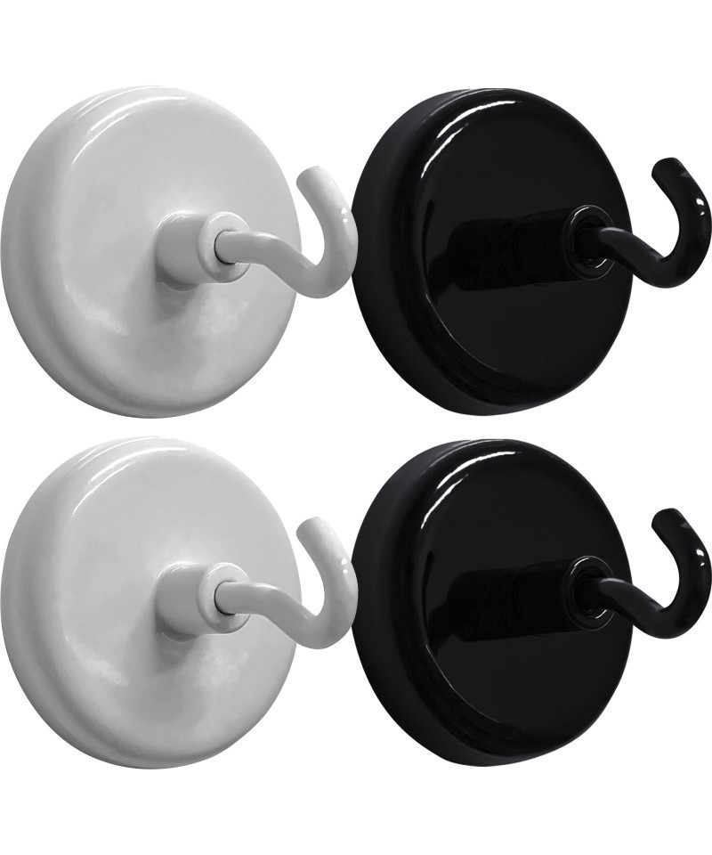 Strong magnets and durable metal construction. Can hold over 80 pieces of 8-1/2" x 11" paper. Each base measures 1-1/2" in diameter. Each pack includes 4 magnetic hooks, 2 black and 2 white.