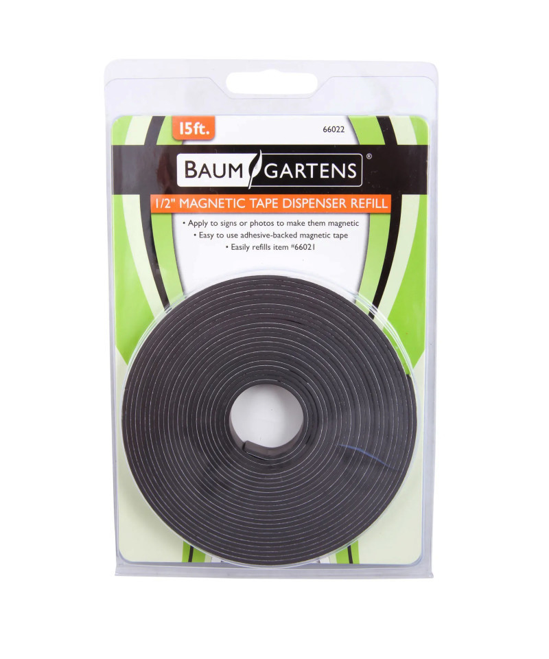 Need a magnetic surface? Now you can turn anything into a magnet with Baumgartens thick, black, adhesive - backed magnetic tape. It cuts easily to any size with scissors or a knife. Simply peel off the backing and attach. This magnetic tape has lots of uses. It's great for arts and craft projects; you can stick it to photos, pictures, business cards to brighten up your office, dorm room, home or classroom. Use it in the garage to stop nails and screws from going astray. Cheer up your cubicle, locker or filing cabinets with custom made magnets. This item is made from materials that are safer for children. This item consists of a 15 foot 1/2" refill for the roll and cut dispenser. Need a magnetic surface? Now you can turn anything into a magnet with Baumgartens thick, black, adhesive - backed magnetic tape. It cuts easily to any size with scissors or a knife. Simply peel off the backing and attach. This magnetic tape is a refill for item 66021.