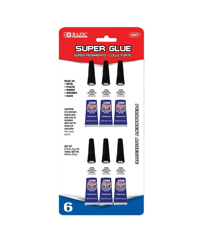BAZIC's super glue is the only solution you need! Suitable for metal, plastic, rubber, ceramics, wood, leather, glass, and most non-porous materials. This latex-free glue is perfect for home improvement and arts and crafts projects, including scrapbooking with our various glue types and applicators. To use, apply glue to one surface only and press pieces together for 15 seconds. For optimal bonding, ensure surfaces are clean and dry. Avoid spreading glue with fingers or the nozzle. Our self-piercing tubes eliminate the need for clamping or pins, making application easy and professional without the mess. Clean the tip and replace the cap immediately after use. Prolonged exposure to light can cure the adhesive, so store in a cool, dry, dark place.