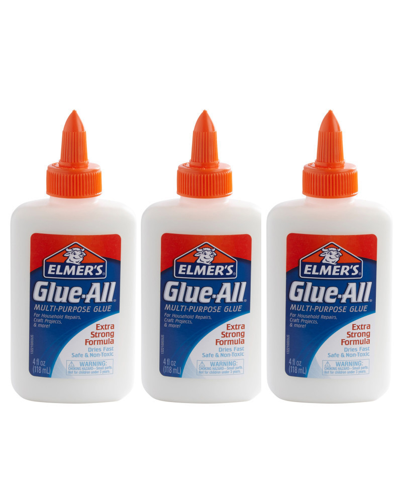 Permanently attach items to paper, fabric, wood, ceramics, leather, and more with the non-toxic adhesive of Elmer's Extra Strong Glue-All Multi-Purpose Glue. Ideal for household jobs, crafts, and school projects, Elmer's Glue-All bonds strongly and dries quickly, and can handle kitchen repairs, workshop and garage work, and other demanding applications. You can also use your liquid glue to create glue slime! Sold as a pack of 3 bottles.