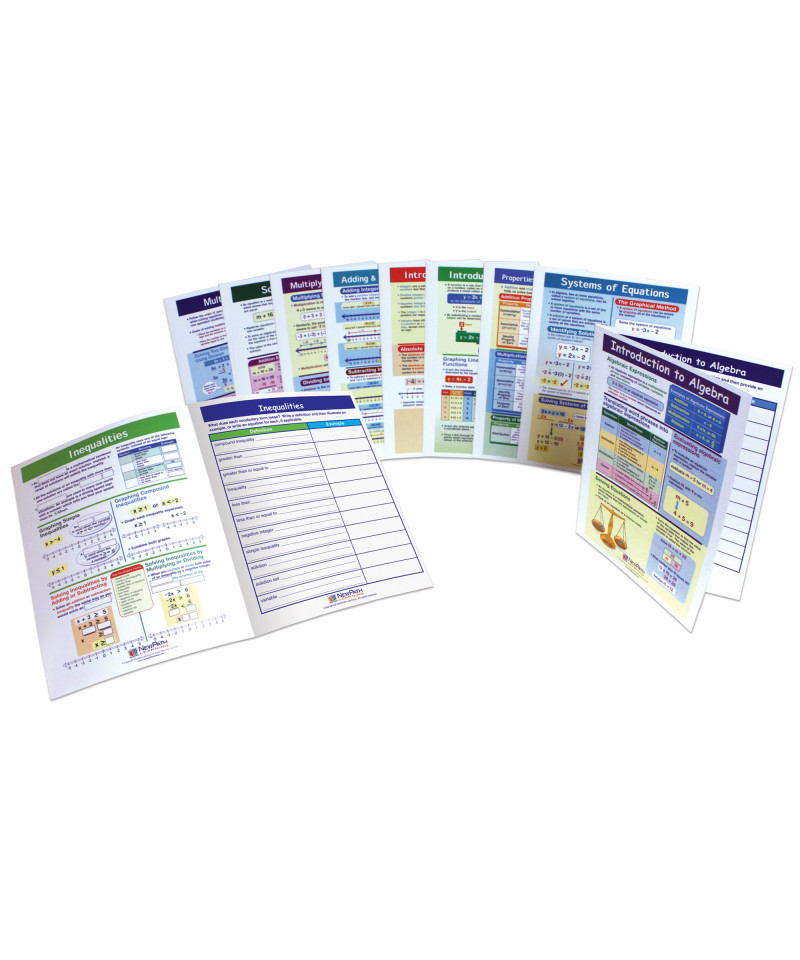 Use visual learning methods to improve student performance. Collection consists of 10 laminated, "write-on/wipe-off" guides. Each 17-inches length by 11-inches width guide covers a different topic and includes 4 panels featuring an illustrated overview of the concept; labeling and review exercises; vocabulary activities; assessment and review questions. Includes Teacher Guide with instructions for successful classroom integration. Also includes 1 Year Premium Subscription to NewPath's Online Learning Program featuring games, interactive exercises, quizzes & more. Comprehensive coverage of: Introduction to Algebra; Properties of Addition and Multiplication; Introduction to Integers; Adding and Subtracting Integers; Multiplying and Dividing Integers; Solving Equations; Multistep Equations; Inequalities; Introduction to Functions; Systems of Equations.